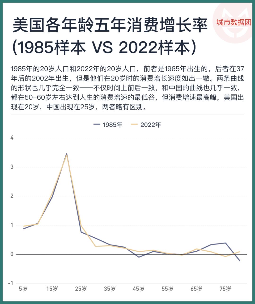 可以看到,1985年的20岁人口和2022年的20岁人口,前者是1965年出生的,后者在37年后的2002年出生,但是他们在20岁时的消费增长速度如出一辙。两条曲线的形状也几乎完全一致——不仅时间上前后一致,和中国的曲线也几乎一致,都在50-60岁左右达到人生的消费增速的最低谷,但消费增速最高峰,美国出现在20岁,中国出现在25岁,两者略有区别。
