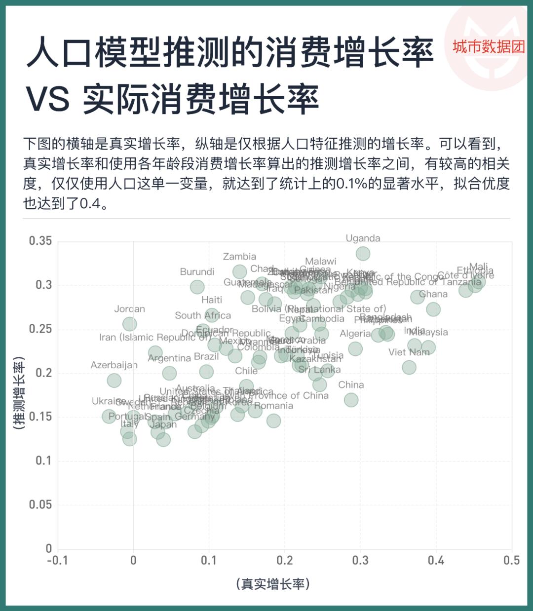 上图的横轴是真实增长率,纵轴是仅根据人口特征推测的增长率。可以看到,真实增长率和使用各年龄段消费增长率算出的推测增长率之间,有较高的相关度,仅仅使用人口这单一变量,就达到了统计上的0.1%的显著水平,拟合优度也达到了0.4。使用一个固定的各年龄人口的消费增长率,再乘上各国的年龄结构,我们可以很好地解释当前国家之间的消费增长率差异!