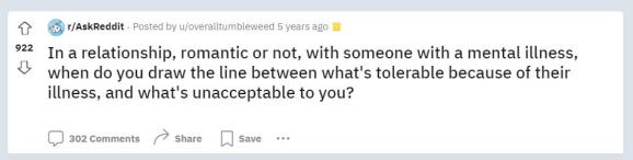 Via:Reddit“我认为评估实际情况是你需要做的第一件事。如果对方的行为充满了辱骂、霸凌或完全不可接受的行为,无论ta是否患有精神疾病,你都不必忍受。如果只是偶尔的呵斥和情绪波动等,则要评估这些行为的频率,并确定这些行为的程度是否过分了。