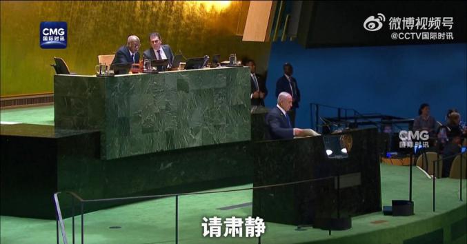 当地时间9月27日上午,以色列总理内塔尼亚胡在第79届联合国大会一般性辩论中发言。