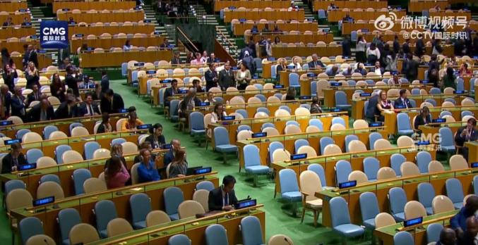 图片来源:CCTV国际时讯视频截图当他走上讲台时,台下的以色列代表团爆发出很大的掌声和欢呼声。不过与此同时,原本在台下就座的多国代表起身离场。