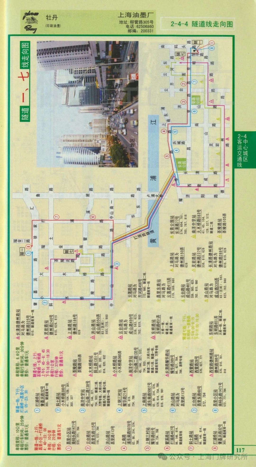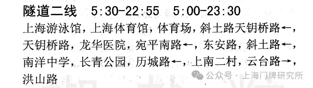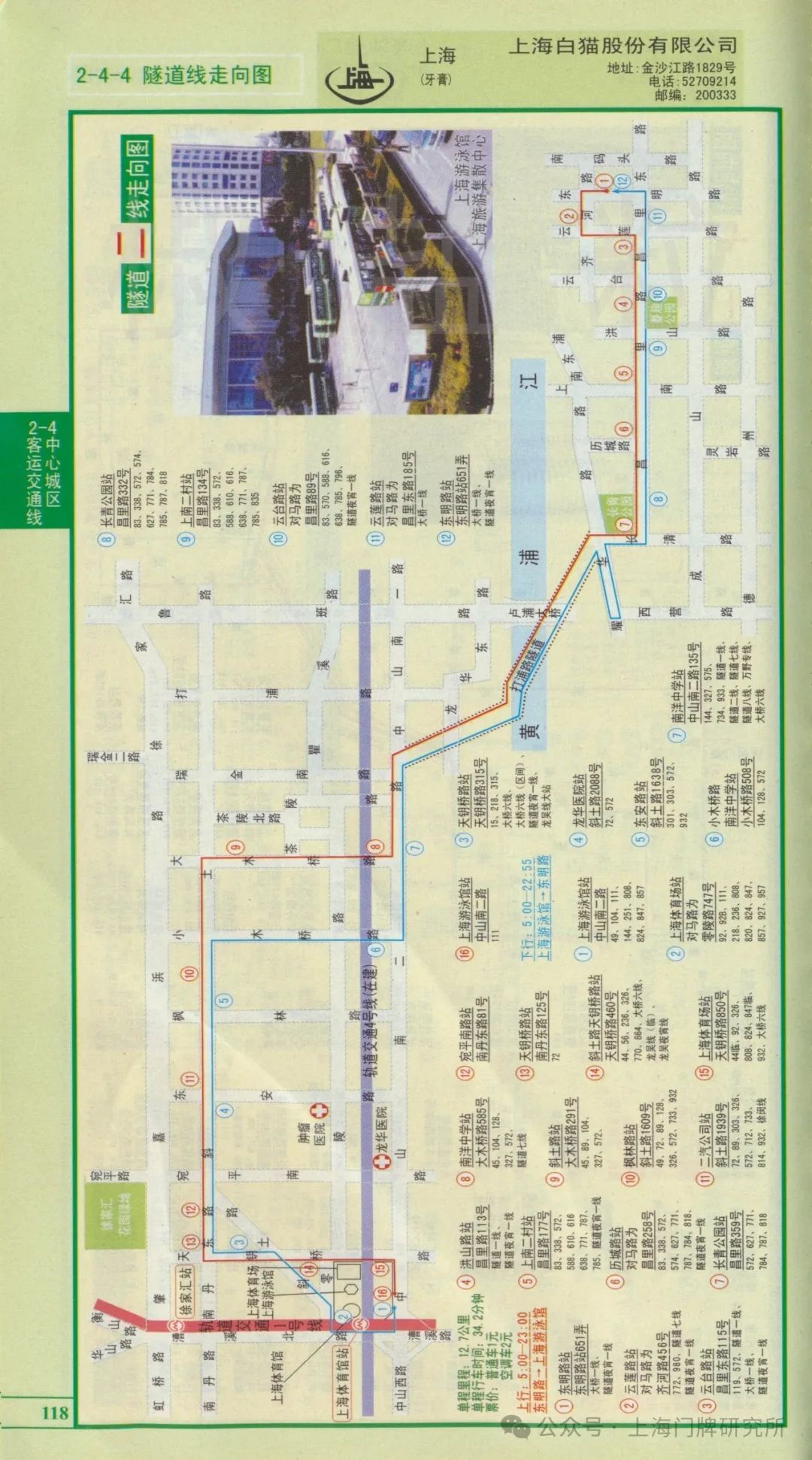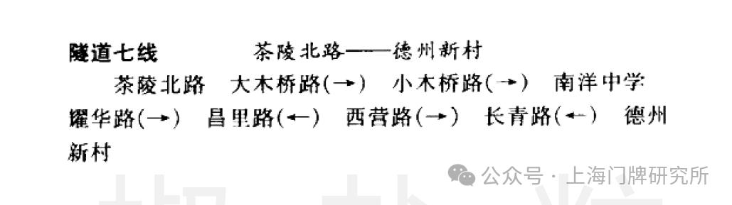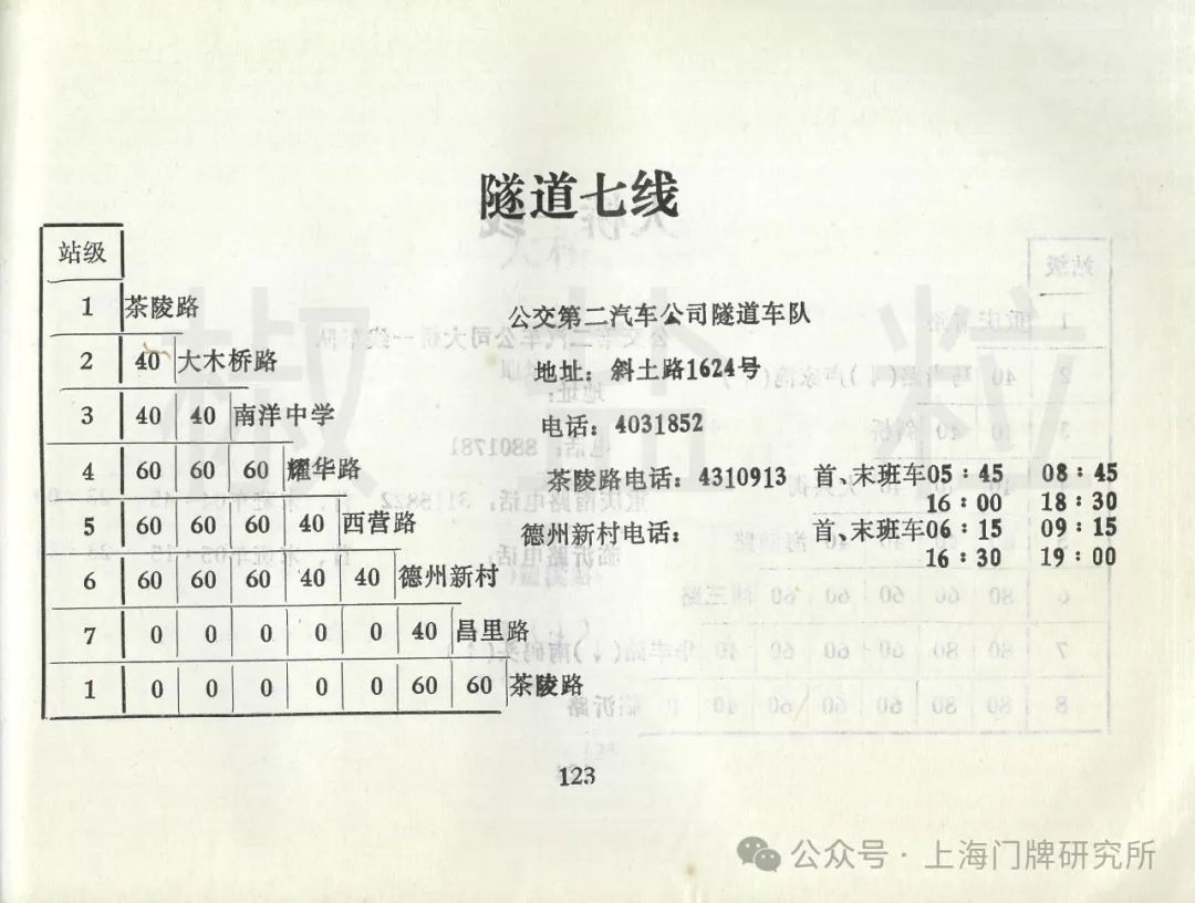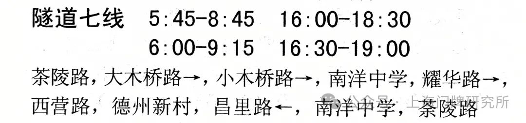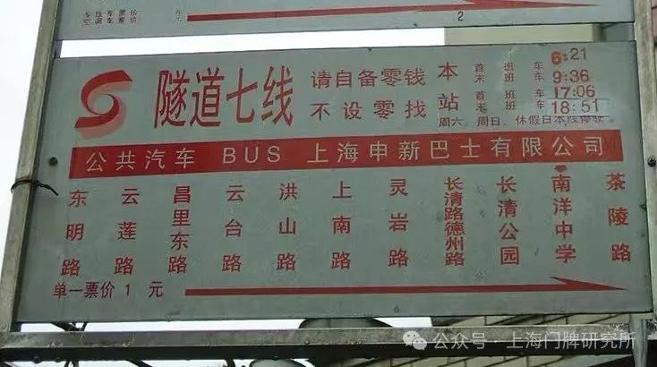 隧道七线站牌(��贺佳伟,2006)●1990年12月11日,上海市公共交通总公司第二汽车公司开辟隧道七线早晚高峰线公共汽车,线路自浦西茶陵路经打浦路隧道至浦东德州新村,通用隧道专线月票。沿途设站:大木桥路、南洋中学、耀华路、西营路、昌里路5个单向站点。首末班车:茶陵路5:45—8:45,16:00—18:20;德州新村6:15—9:15,16:30—19:00。
