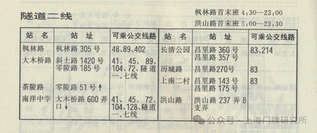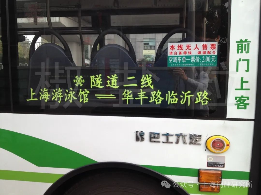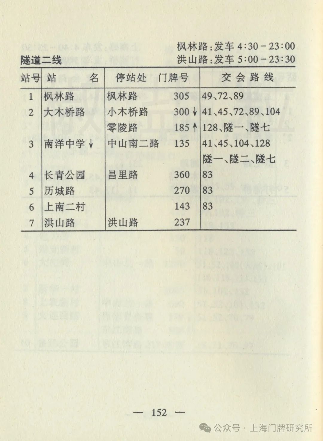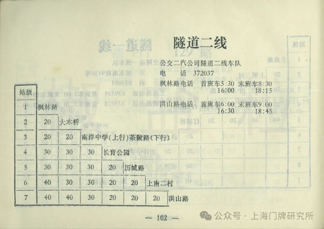 隧道七线站牌(��贺佳伟,2006)●1990年12月11日,上海市公共交通总公司第二汽车公司开辟隧道七线早晚高峰线公共汽车,线路自浦西茶陵路经打浦路隧道至浦东德州新村,通用隧道专线月票。沿途设站:大木桥路、南洋中学、耀华路、西营路、昌里路5个单向站点。首末班车:茶陵路5:45—8:45,16:00—18:20;德州新村6:15—9:15,16:30—19:00。