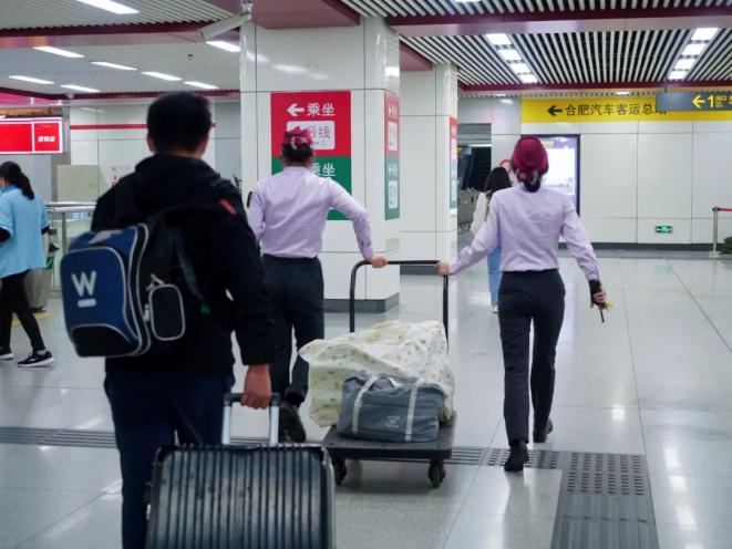 多个站点设立“ 幸福+”服务站,提供线路指引便签、行李打包搬运、爱心预约、便民服务箱、咨询服务等全方位便民服务,解决乘客出行需求;合肥火车站、合肥南站等重点站设置有“拎包小分队”,提供行李推车,帮助广大乘客便捷出行;上线服务三包“服务百宝箱”“能量补给包”“医疗备品包”,提供给有需要的乘客免费使用。