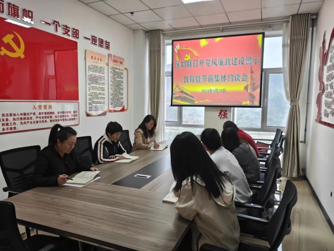 在国庆佳节来临之际,为深入落实全面从严治党要求,认真贯彻中央八项规定精神及省市区委实施细则精神,持续巩固深化党纪学习教育成果,营造风清气正的节日氛围。9月29日,区妇联召开党风廉政建设警示教育暨节前集体约谈会,全体干部职工参加会议。