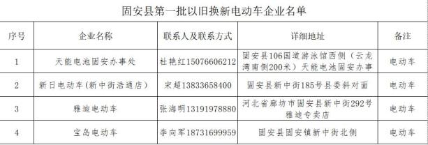 活动企业:天能电池固安办事处、新日电动车(新中街浩通店)、雅迪电动车、宝岛电动车