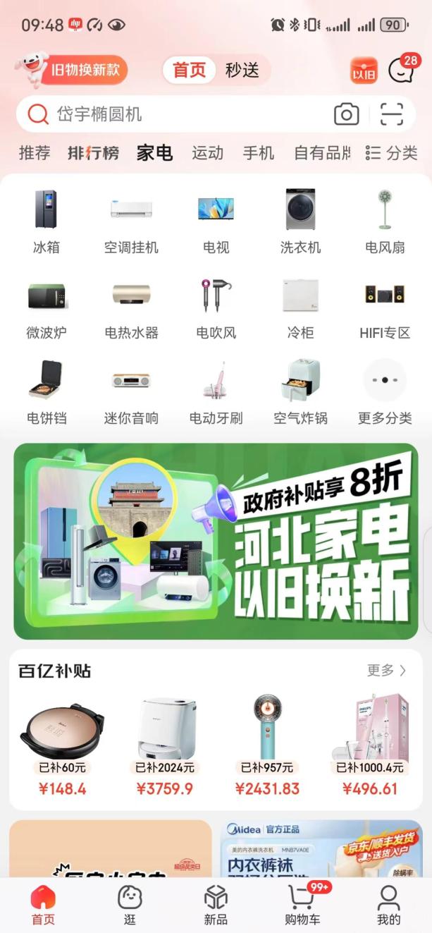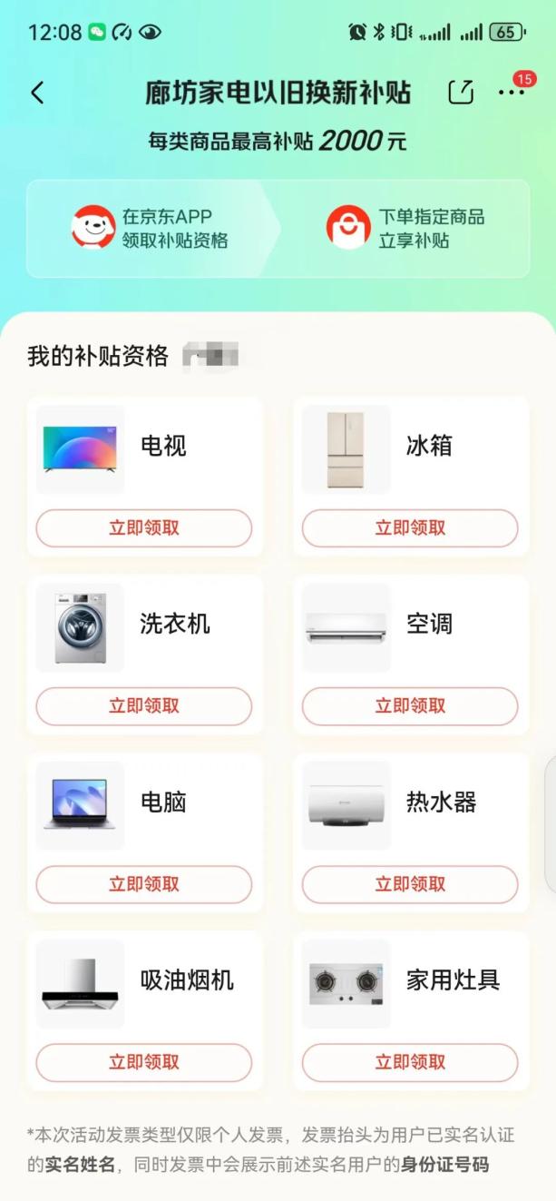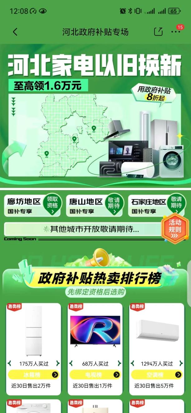 打卡京东APP,从首页进入“家电”板块,点击“河北家电以旧换新”专栏,进入后选择廊坊地区,可以领取廊坊地区各品类家电补贴资格 ,选购8大类家电产品并享受补贴。