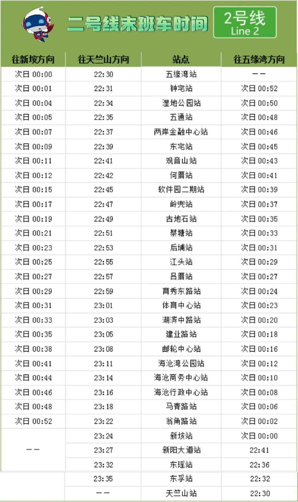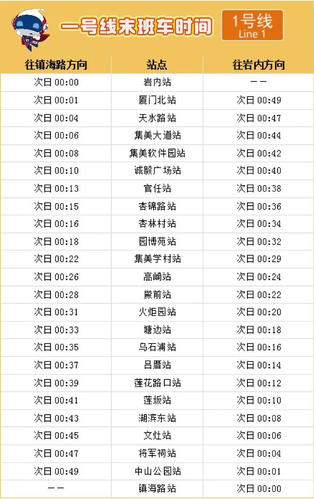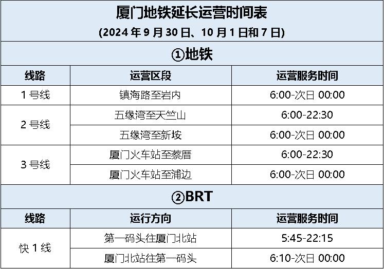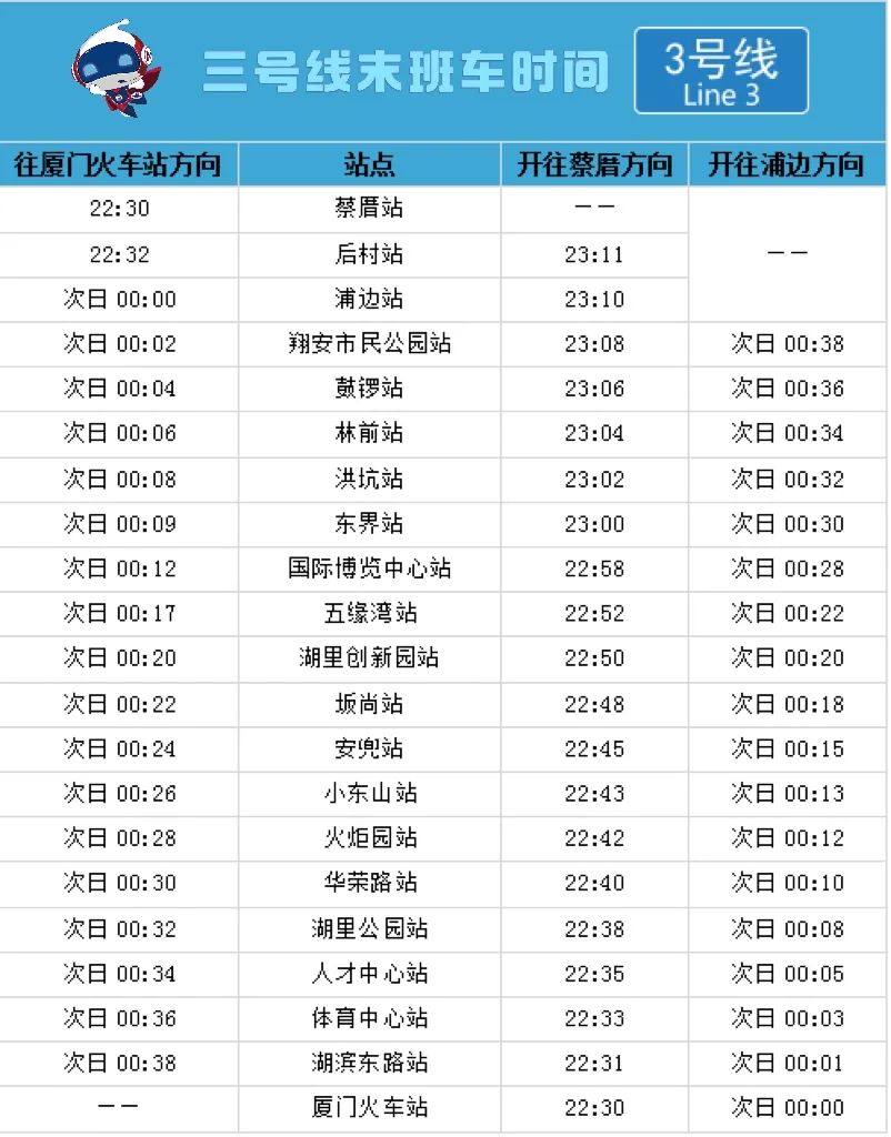 1号线、2号线(五缘湾站至新垵站)、3号线(厦门火车站站至浦边站)延长运营1小时,延长运营时段行车间隔10分钟。