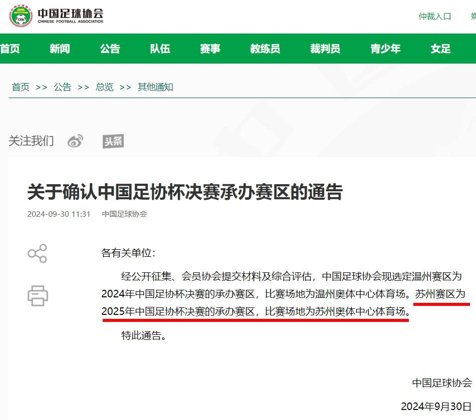 原标题:《定了!2025年中国足协杯决赛在苏州举行!》