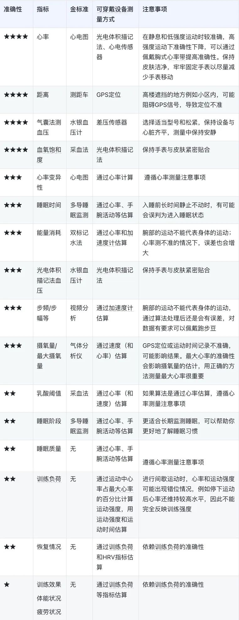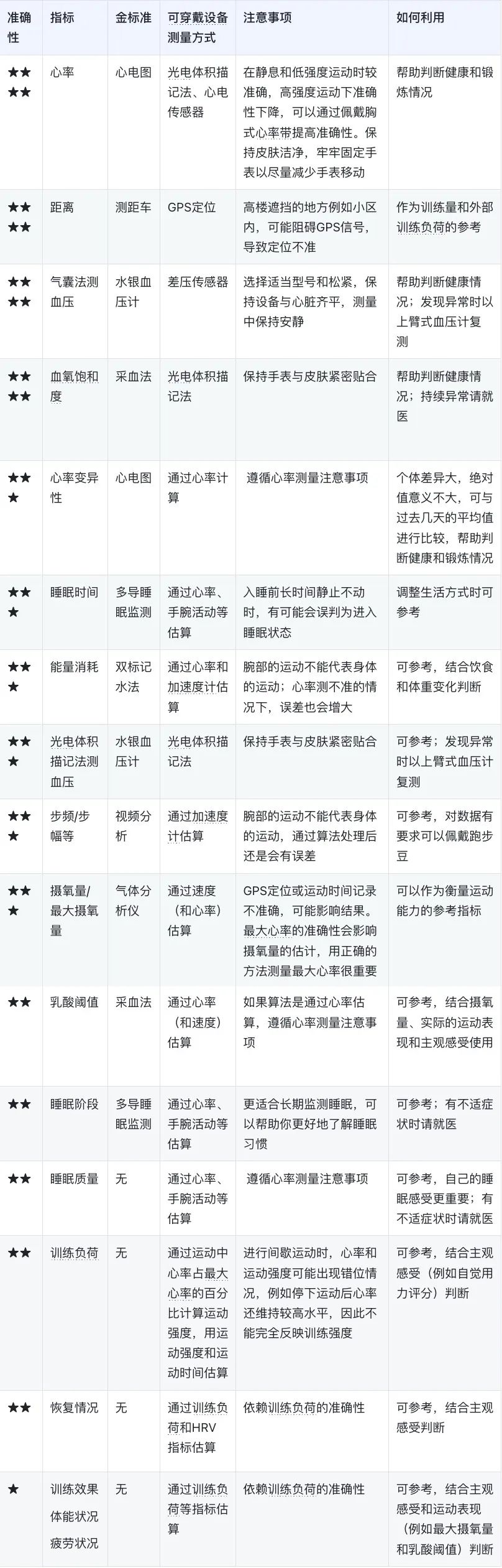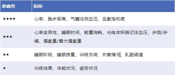 这里没有一项指标达到 5 星,也就是没有数据是绝对准确的。为什么会测不准呢?可能跟测量方法、传感器、算法、佩戴和解读方式有关。