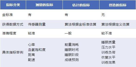 创造的指标,是一些不存在测量金标准的指标,它们是在前两类指标的基础上,算法根据一些定义或想法创造出来的,例如恢复情况、训练效果等。由于没有测量金标准可以比较,加上不同厂商之间的传感器硬件和算法不一致、指标的算法也不公开,很难验证数据的准确性。