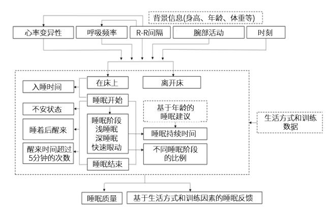 可穿戴设备评价睡眠的方式,是通过测量心率和手腕活动(加速度传感器),算出心率变异性和呼吸频率等指标,再结合个人的年龄、身高、体重和性别等背景信息,基于神经网络模型,最终得到上床和起床时间、睡眠开始和结束时间、睡眠总时长和睡眠潜伏期、清醒时长,各个睡眠阶段的时长和比例,以及基于这些信息得出的总体睡眠评分。