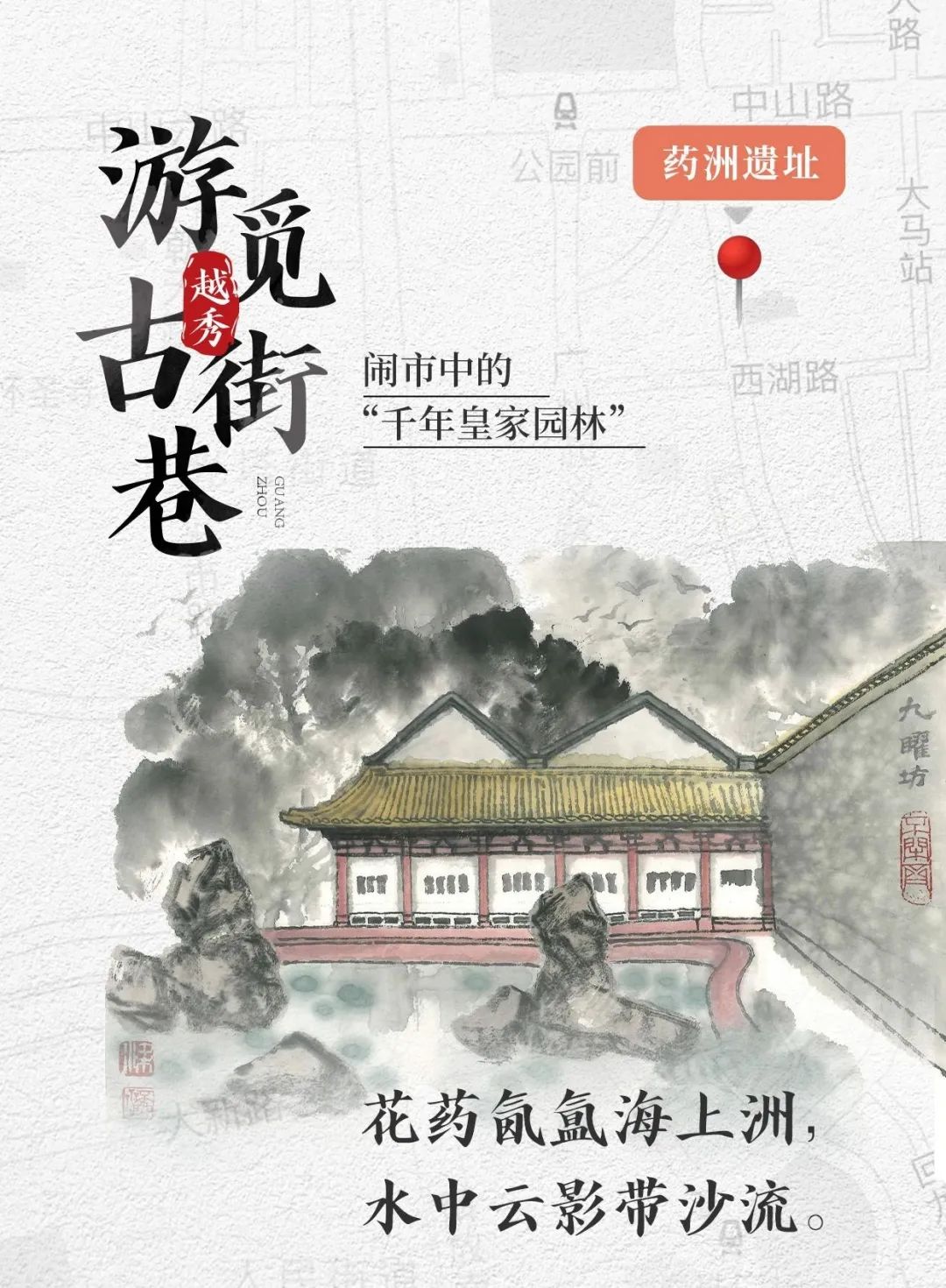 其实在繁华的北京路步行街旁还藏匿着一座“千年皇家园林” —— 药洲遗址。这是南汉皇帝刘岩下令开挖的一座皇家园林。取名“药洲”,是因为湖中有一座沙洲岛,栽植着花药。药洲园内山石如林,水中有9块嶙峋怪石,也叫做“九曜石”,据说是因为石景的布列对应着天上的九曜星宿,于是有了这个名字。