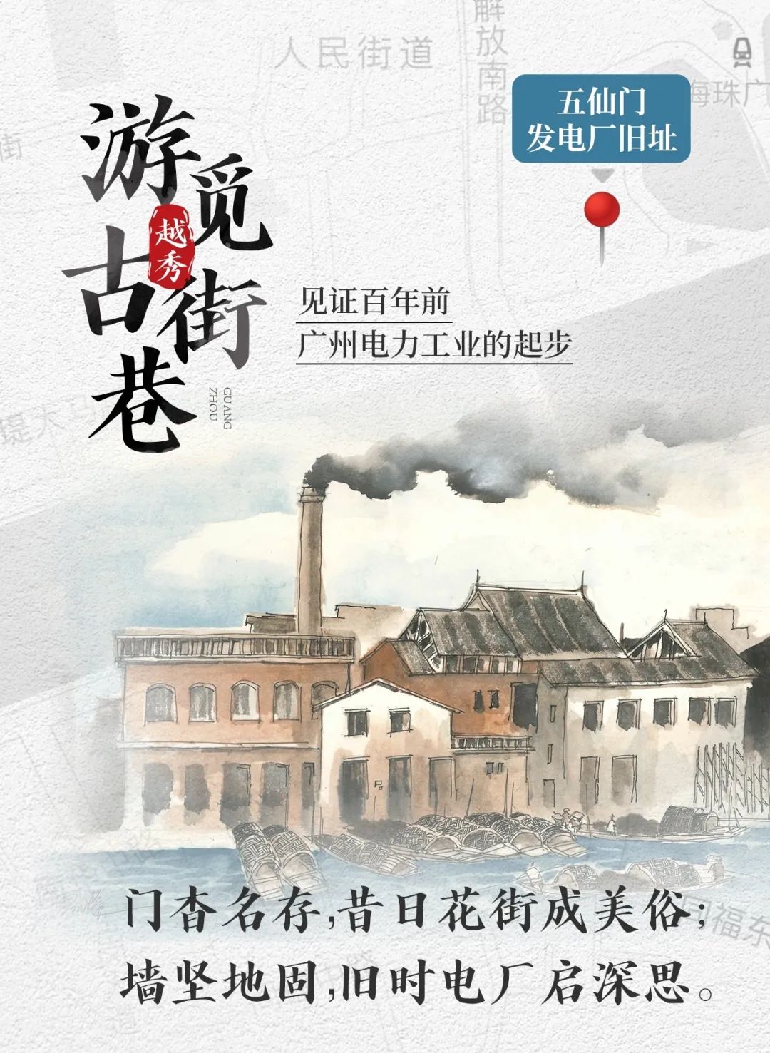 明清时期广州城有多个城门,如今最广为人知的是五仙门。在明代,广州的花市在城南七个城门口一带。花开时节,花农早上从珠江南岸的花田摘下鲜花,乘船渡江到北岸,上岸后最近的城门便是五仙门,所以五仙门花市最为热闹。不过,能延续五仙门名气的还要数“五仙门发电厂”。1901年,英商旗昌洋行在五仙门南面建起发电厂,名为粤垣电灯公司。八年后,广东官方和以华侨为主的民间商人合股组成广州电力股份有限公司,将八年前英商旗昌洋行开办的粤垣电灯公司赎回自办,这就是广州最早的电力公司,也是华南地区最早的商办电厂。