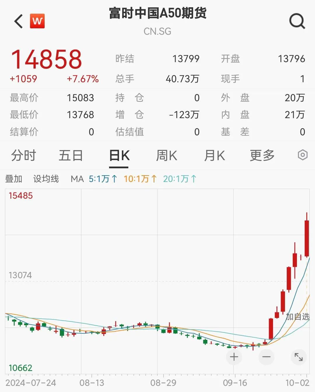 10月2日,富时中国A50指数期货涨幅扩大至9%,突破15000点,创2022年2月以来新高。截至收盘,报14858点,上涨7.67%。