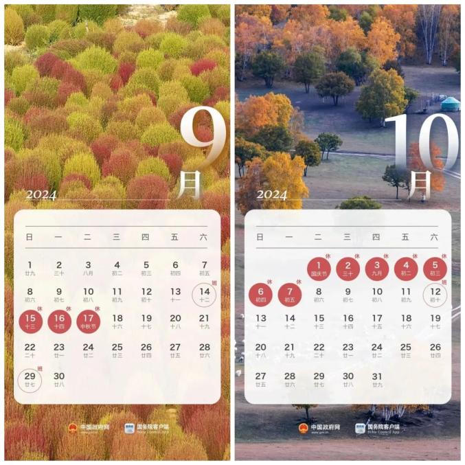 根据《国务院办公厅关于2024年部分节假日安排的通知》:10月1日至10月7日,国庆节放假调休,共7天。9月29日(星期日)、10月12日(星期六)上班。