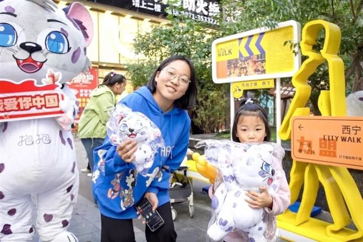 力盟商业步行街位于城西区经济文化的核心圈,是我省首个4A级景区的商业街,更是青海文旅产业融合发展的窗口。记者在现场看到,国庆假期力盟商业步行街人气更旺了。人流中,四只可爱的“雪豹”穿梭其中,他们手里拿着各种宣传手卡,提着雪豹文创包,包包里装满了各类文创品,看到孩子们,他们随即上前打招呼合影,可爱的“雪豹”摆出各种poss与孩子们配合,同时分发文创产品,向大家宣传“雪豹之都”的意义和内涵。外地游客也被这种形式的宣传深深吸引,他们询问“雪豹之都”是什么?周围的工作人员立刻走上前去进行解读,并送上精美的雪豹文创产品,让游客感受到“雪豹之都”的热情好客。