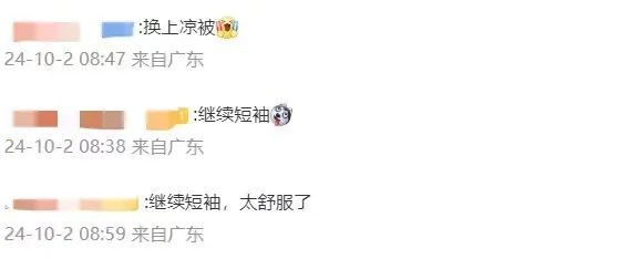 天气很好,很多网友说,“太舒服了”,还在穿短袖短裤,也有网友说“冻”,换上了凉被。