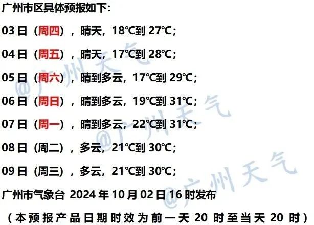广州市气象台预计,10月1日—3日,受中等强度冷空气影响,广州日平均气温下降,风力加大,体感转清凉。明天(10月3日)