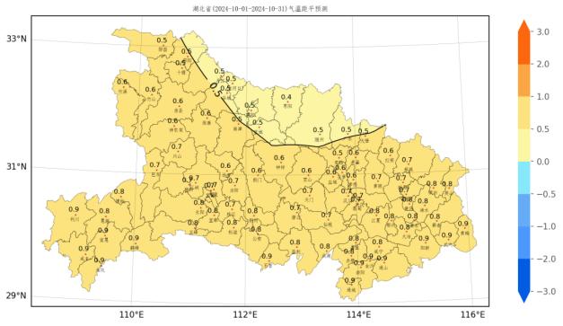 △湖北省各县市2024年10月气温距平预测图(℃)因降水引发地质灾害处于较低易发期
