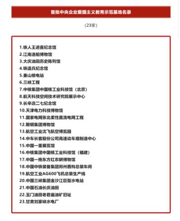 近日,国务院国资委命名发布首批23家中央企业爱国主义教育示范基地。