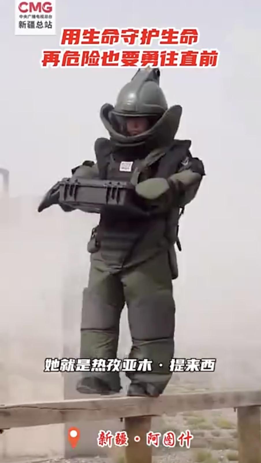 100斤女警穿70斤衣服排爆。近日,新疆女警热孜亚木·提来西,开展排爆训练。体重只有100斤的她身穿70多斤排爆服,端着设备稳稳走过独木桥、徒手穿针引线,处置废旧炮弹、处理疑似爆炸物等。她说:“我愿意用鲜血捍卫忠诚,用生命守护生命!”