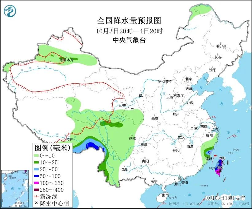 全国天气:西藏东南部、福建东北部、台湾岛等地部分地区有大到暴雨,其中,台湾岛东部和南部等地部分地区有大暴雨,局地特大暴雨(250~300毫米)。