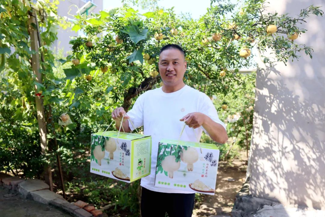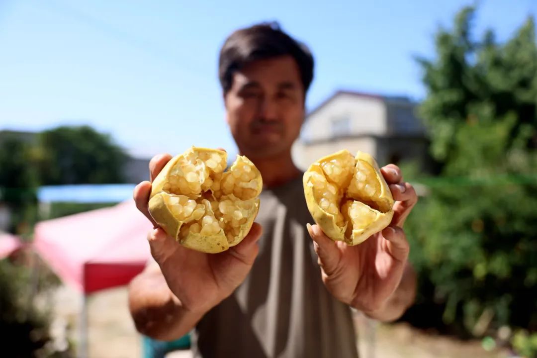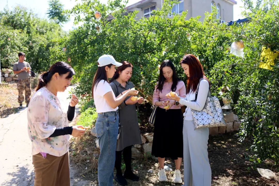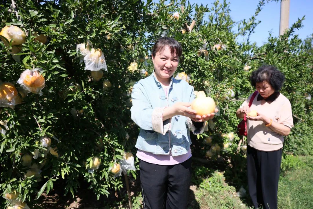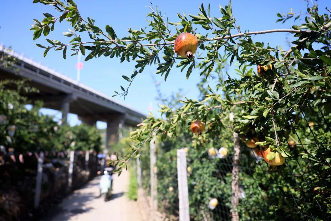 随后,记者顺着小道向涂山进发,看到两侧满园的白花玉石籽和红玛瑙等长势喜人,颗颗饱满清甜的石榴在阳光下散发着诱人的光芒。在涂山半山腰,遇见了长青乡政府工作人员崔雅静,她带着一群闺蜜在品尝石榴,“我这几个闺蜜知道石榴是长青乡特色种植产业,节前就约我,这好不容易时间凑在一起,今天赶紧过来采摘。”她说,“目前乡里这几个村的石榴都进入了成熟采摘期,共种植有一万多亩,今年预计总产量达1250万公斤,年产值过亿元。”