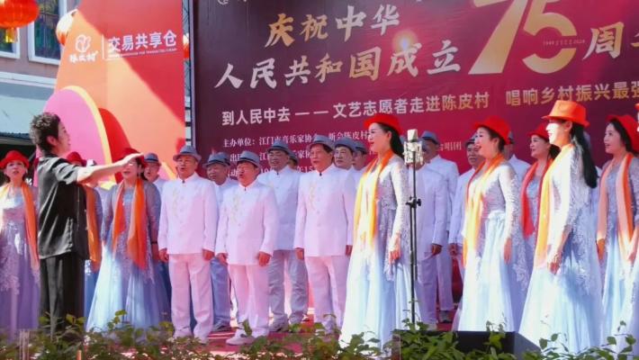 “香甜而美丽,新会陈皮”“五星红旗你是我的骄傲”“黄河在咆哮、黄河在咆哮”“我亲爱的祖国 你是大海永不干涸”……在新会陈皮村中庭舞台,“到人民中去”音乐会火热开演,由江门市文艺志愿者带来的“陈皮+”音乐、节庆歌曲一首接一首,从带有新会陈皮元素的原创歌曲《陈皮的故乡》,到表达了人民对美好生活的向往和追求的《上春山》,再到全场大合唱的《我和我的祖国》,文艺志愿者们的激情表演点燃了全场气氛。