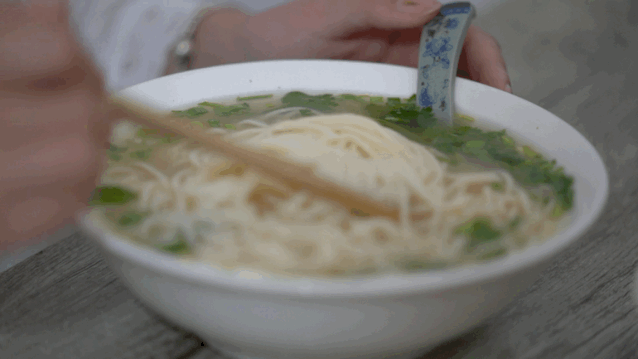 ▲205国道附近的胡氏面馆面条下锅两分钟左右就能捞出,碗中的底汤用精选大骨熬制,汤头油而不腻。铺上刚做的大肉,放上一两勺剁碎的蒜末,一碗散发着麦香、肉香和蒜香的大肉面就可以上桌了。