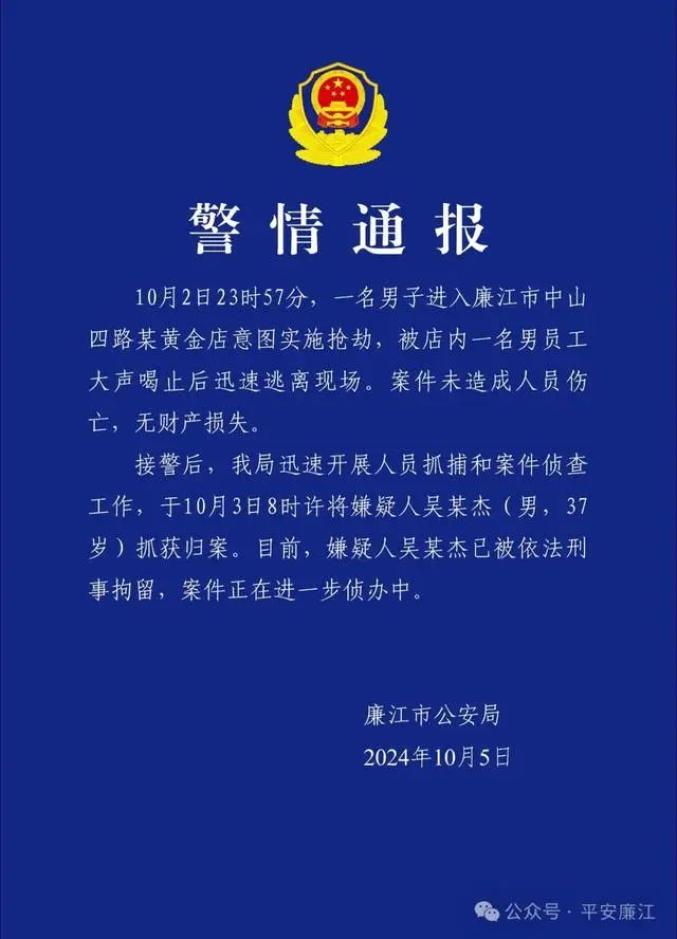广东廉江市公安局10月5日通报,10月2日23时57分,一名男子进入廉江市中山四路某黄金店意图实施抢劫,被店内一名男员工大声喝止后迅速逃离现场。案件未造成人员伤亡,无财产损失。接警后,公安局迅速开展人员抓捕和案件侦查工作,于10月3日8时许将嫌疑人吴某杰(男,37岁)抓获归案。目前,嫌疑人吴某杰已被依法刑事拘留,案件正在进一步侦办中。