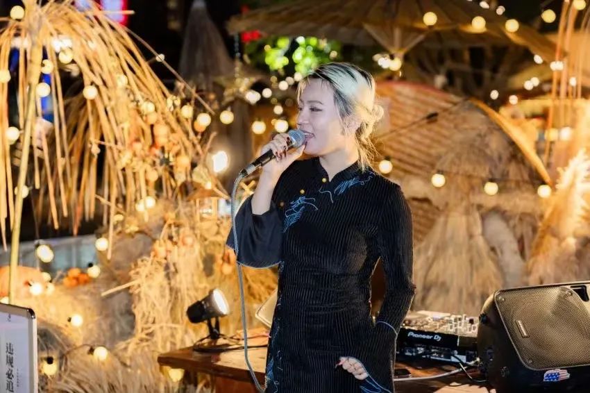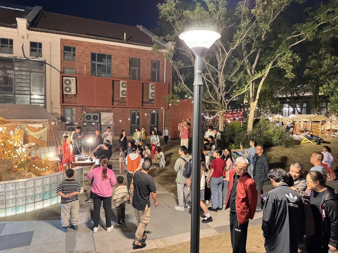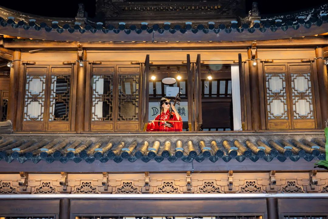 4日晚7点半,站在运河艺术公园C区待月楼下,主理人“墨镜三弦”几首开场曲立刻吸引正在逛市集的游客驻足、聆听、拍照,“超有感觉,古典与现代碰撞,爱了爱了!”来自苏州大学的小陆和室友们开启了现场直播。