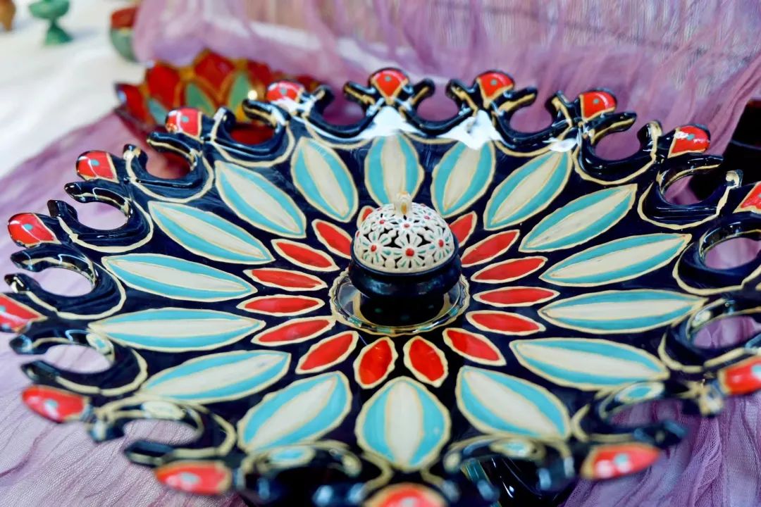 上漆、烘烤、着色,主理人於世一正在打磨一盏荷叶公道杯,“不同于一般的工艺品,这漆是漆树枝叶刮下的原浆,精心孕育一件作品。”一旁感兴趣的父子俩听得入神。