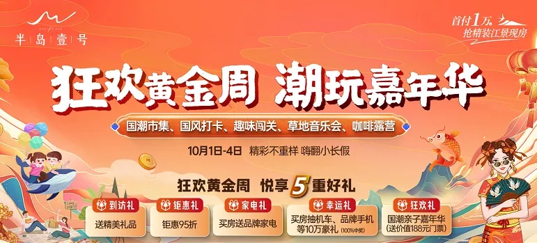 10月1-4日,半岛壹号举行“国潮嘉年华”活动,开展国潮、闯关、音乐会、市集、露营等互动环节,让市民群众从白天玩到夜晚,在体验热闹非凡的国潮盛会的同时吸引市民看房购房,为楼盘带来更多意向客户。