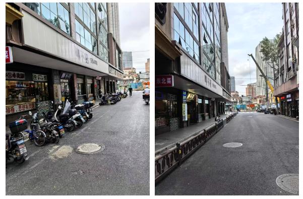 非机动车整治前后对比图道路提升工作还充分考虑商户进出货、外卖小哥车辆临时停放等合理需求。通过微改造,乍浦路实行非机动车单边停放。西侧设置了人行护栏隔离出人行通道,解决人车争路问题,并在隔离栏中间设置了若干个出入口,方便商户进货卸货。东侧设置了非机动车临时停车区域,放置“外卖取餐临时停车点”引导立牌,方便外卖小哥停放电动车且不影响车辆通行。昆山路段预留了非机动车停车区域,方便疏导沿街商户员工日常停车需求。通过改造提升,实现了人车分离,消除了安全隐患,保障了市民出行,街区面貌焕然一新。