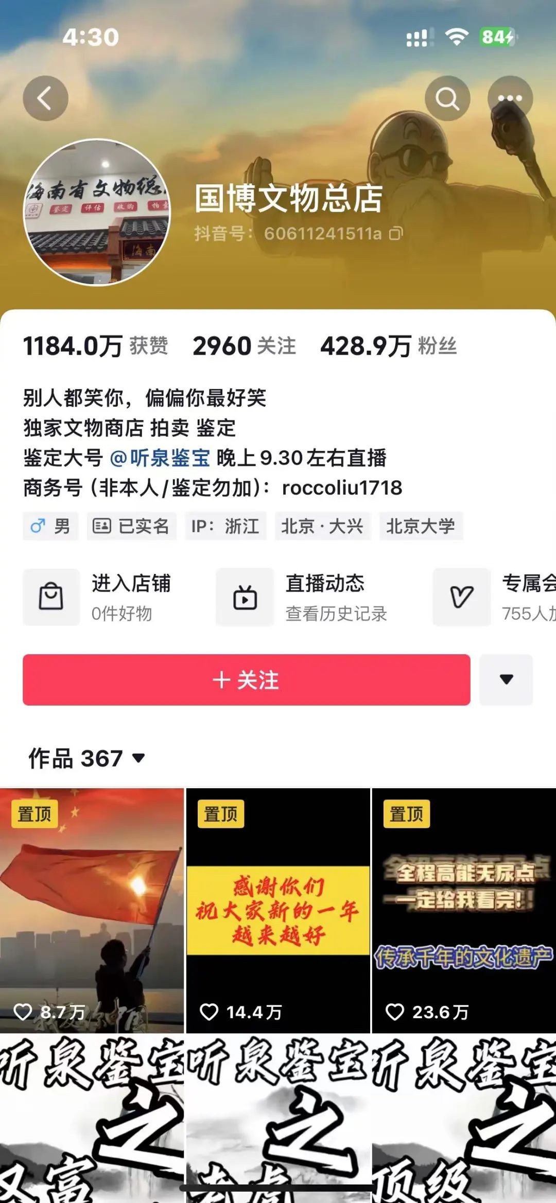 反差感是互联网走红的一条捷径,当看似两个相互矛盾或对立的元素并放在一起,戏剧效果油然而生。听泉鉴宝在自我介绍中标注了“北京大学”,结合其直播鉴宝时丰厚的考古文物知识,于是拥有了“考古高材生”的学霸光环。