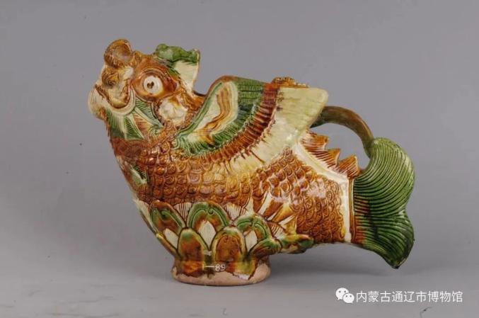 镇馆之宝——辽三彩摩羯壶通体浮雕鱼鳞