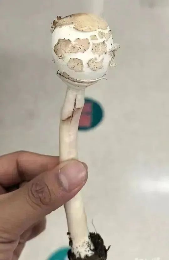 仔细观察患者带来的这些白蘑菇,伞盖是白色的,伞盖表面分布着褐色斑点,菌杆长长的,呈浅棕色,高度疑似毒蘑菇大青褶伞。