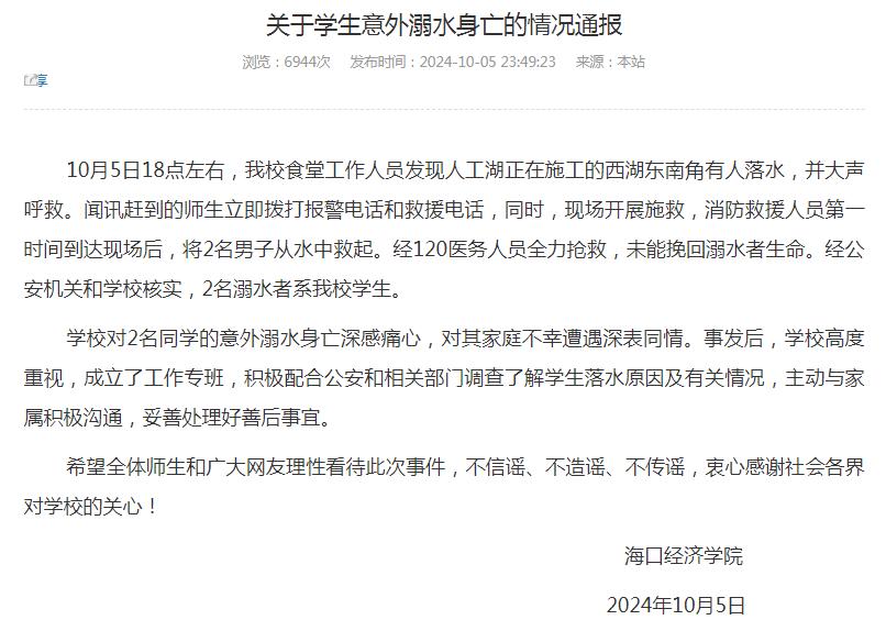 10月7日,记者从海口经济学院获悉,5日,学校2名学生在施工的人工湖落水,经抢救无效身亡。