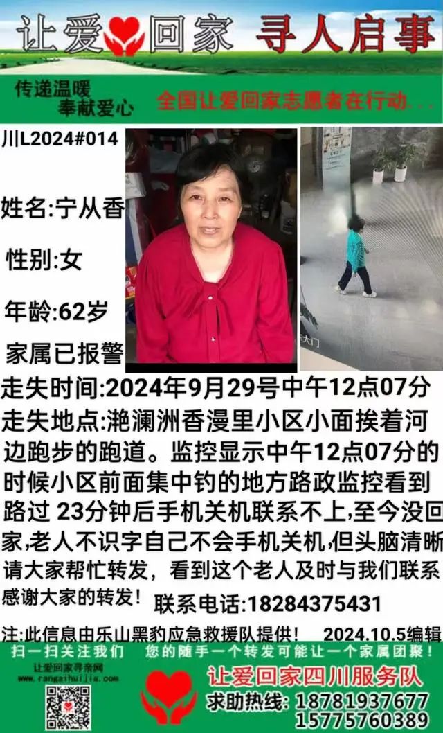 根据该网友发布的寻人启事,她失联的妈妈名叫宁从香,今年62岁,家住乐山滟澜洲香漫里小区。监控显示,9月29日中午12点,她最后出现在小区前面河道集中垂钓的地方,23分钟后手机便关机联系不上。