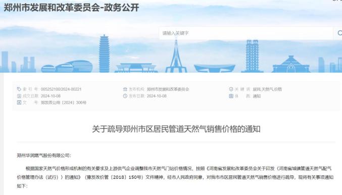 郑州华润燃气股份有限公司:根据国家天然气价格形成机制的有关要求及上游供气企业调整我市天然气门站价格情况,按照《河南省发展和改革委员会关于印发〈河南省城镇管道天然气配气价格管理办法(试行)〉的通知》(豫发改价管〔2018〕150号)文件精神,经市人民政府同意,对我市市区居民管道天然气销售价格进行疏导,现将有关事项通知如下: