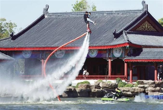 在园博园映月湖上,游客正在体验水上飞人。殷实 摄不断开展“+文旅”活动