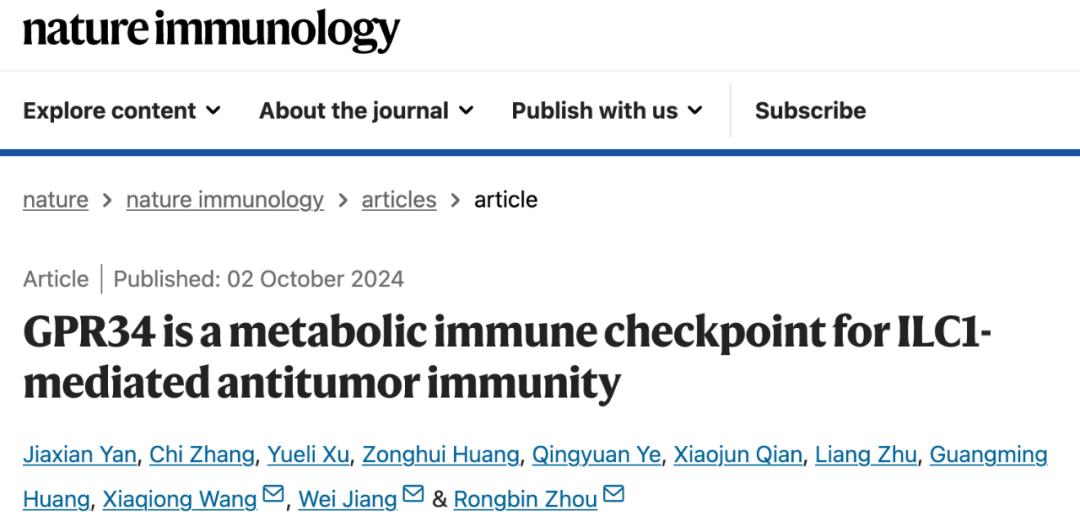 2024年10月2日,中国科学技术大学生命科学与医学部、合肥综合性国家科学中心大健康研究院周荣斌教授与中国科学技术大学生命科学与医学部江维教授、王夏琼副研究员等在 Nature Immunology 期刊发表题为:GPR34 is a metabolic immune checkpoint for ILC1-mediated antitumor immunity 的研究论文,
