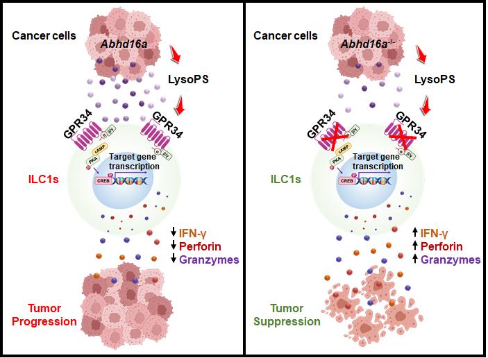 在这项新研究中,研究团队通过构建tdTomato-GPR34报告小鼠,发现GPR34在ILC1中高表达,而在cNK细胞上不表达,提示GPR34可以作为一个新的区分ILC1和cNK的标志物。进一步利用多种不同的皮下瘤和结肠癌肝转移的原位瘤模型,研究团队发现,GPR34全身基因缺陷或ILC1条件缺陷均能增加肿瘤中ILC1的比例、数目和抗肿瘤活性,并抑制肿瘤生长,表明GPR34通过抑制ILC1的抗肿瘤活性来促进肿瘤生长。接下来,研究团队探究了GPR34调控ILC1介导的抗肿瘤免疫的机制。通过质谱检测,发现GPR34配体LysoPS在肿瘤间质液积累。体外实验表明LysoPS以GPR34依赖的方式通过cAMP-PKA-CREB途径抑制ILC1的活化。敲低肿瘤细胞上LysoPS合成酶ABHD16A的表达可以降低肿瘤间质液中LysoPS的水平并抑制了肿瘤的生长。此外,抑制肿瘤中LysoPS的产生可增加肿瘤中ILC1的数量、比例以及抗肿瘤活性。这些结果表明,肿瘤来源的LysoPS通过GPR34抑制ILC1介导的肿瘤免疫从而促进肿瘤生长。