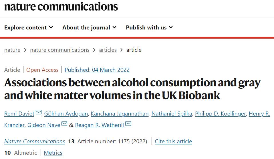 许超医生微博截图2022年发表在《自然·通讯》上的一项研究,对超过3.6万名中老年人的数据进行了分析并发现:即使是少量饮酒也与大脑容量的减少有关。饮酒越多,脑体积改变的程度越明显。