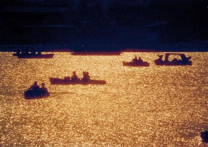 20世纪80年代,夕阳下,泛舟银锄湖。图片摄影:陆杰(下同)