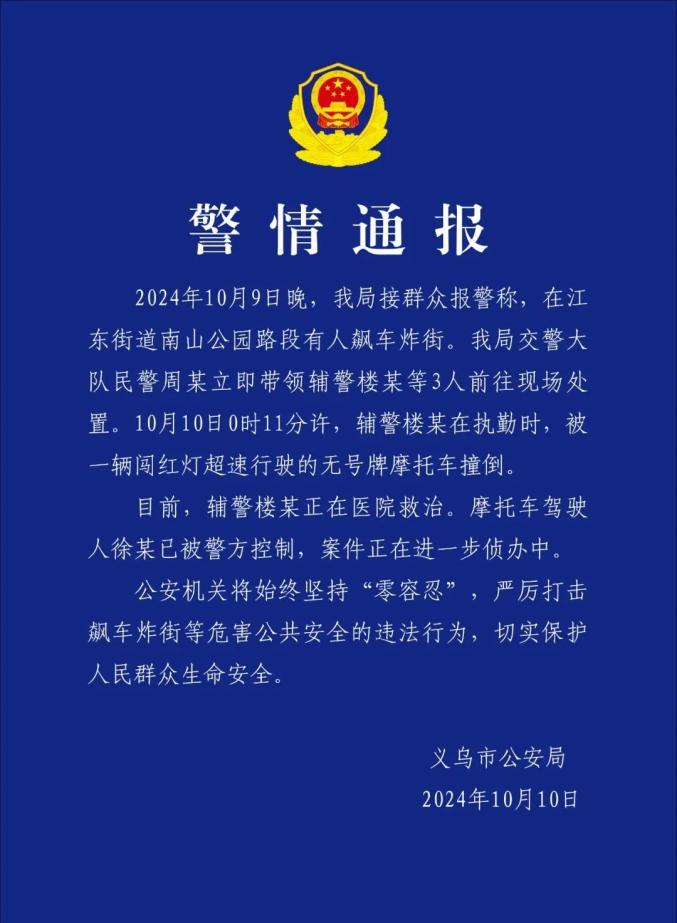 10月10日,浙江省义乌市公安局发布警情通报,2024年10月9日晚,该局接群众报警称,在江东街道南山公园路段有人飙车炸街。该局交警大队民警周某立即带领辅警楼某等3人前往现场处置。10月10日0时11分许,辅警楼某在执勤时,被一辆闯红灯超速行驶的无号牌摩托车撞倒。