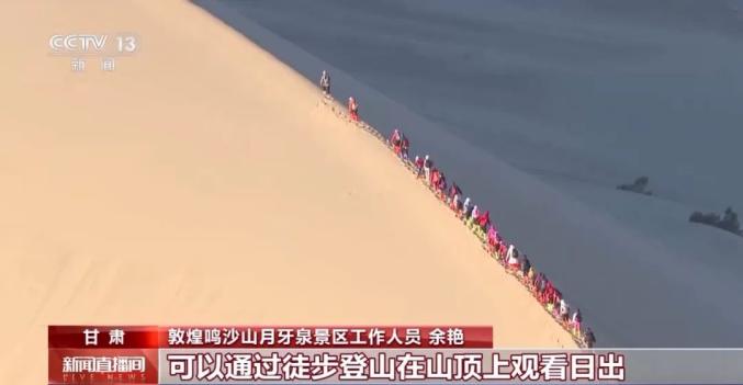 敦煌鸣沙山月牙泉景区工作人员 余艳:可以通过徒步登山在山顶上观看日出,也可以选择乘骑骆驼看沙漠中的日出,我们还可以选择在滑翔机或者直升机上,高空俯瞰阳光洒在山上的景色。