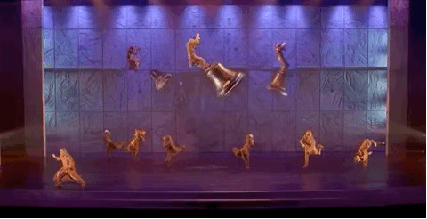 ○ 从天而降的大钟里,演员倒挂如荡秋千一般在空中飞跃。舞台上,还有演员悬挂在半空的钢铁横杠上翻腾、以“跑酷”营造出战斗情节等惊险现场。