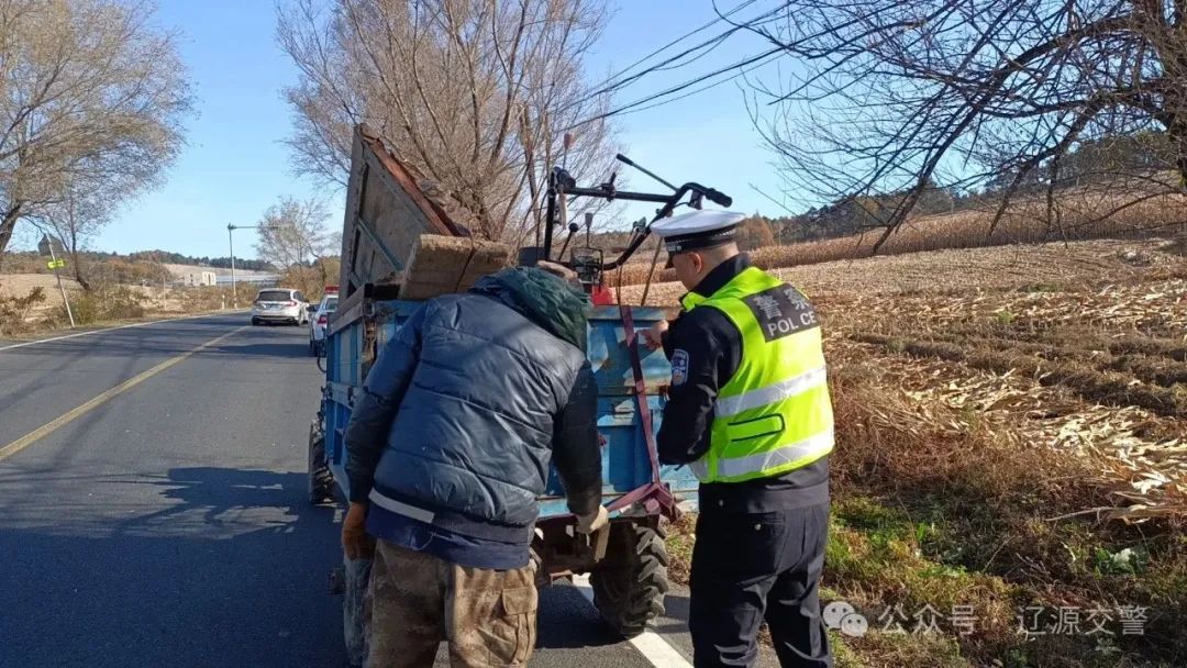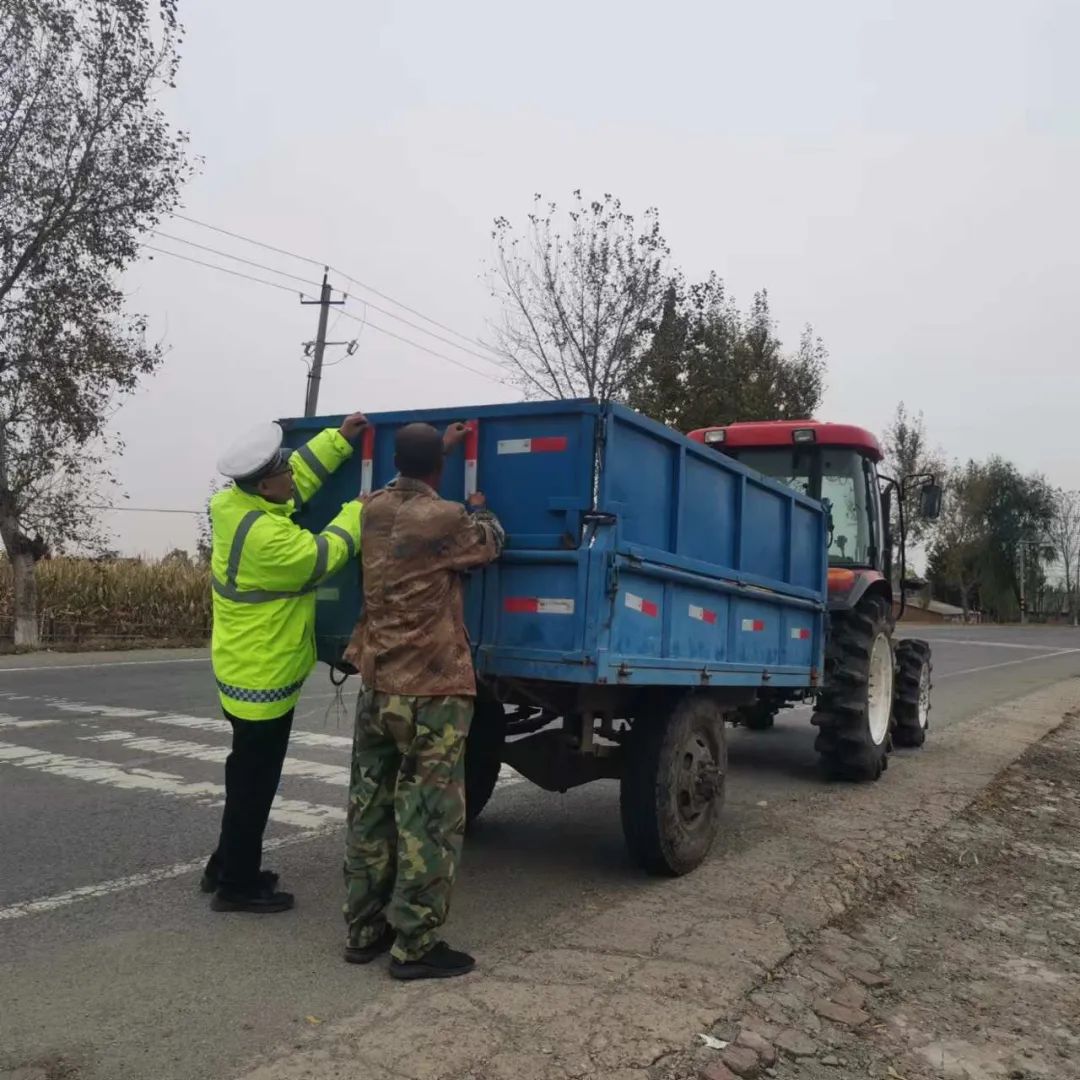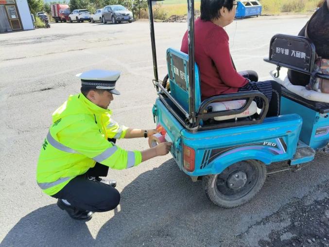 随着秋收季到来,长春市公安局交巡警支队榆树大队全面启动交警执法站,开展“晨昏行动”,多举措全力以赴“保秋收、保安全”,预防和减少秋收期间农村道路交通事故发生。在农村地区秋收集中出行路段,在“一早一晚”重点时段,他们加大路面巡逻管控力度,强化对农用机械及三轮车违法载人、大货车超速超载等严重交通违法行为查处力度,同步开展“亮尾”行动,为没有反光标识和反光标识破损、不清楚的农用机械及三轮车免费粘贴反光标识,确保在夜间和可见度低的条件下,车辆能被看见。